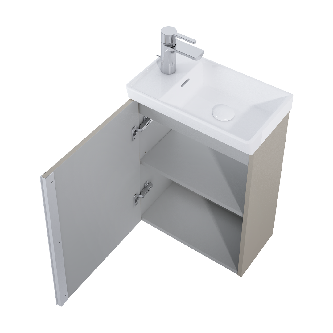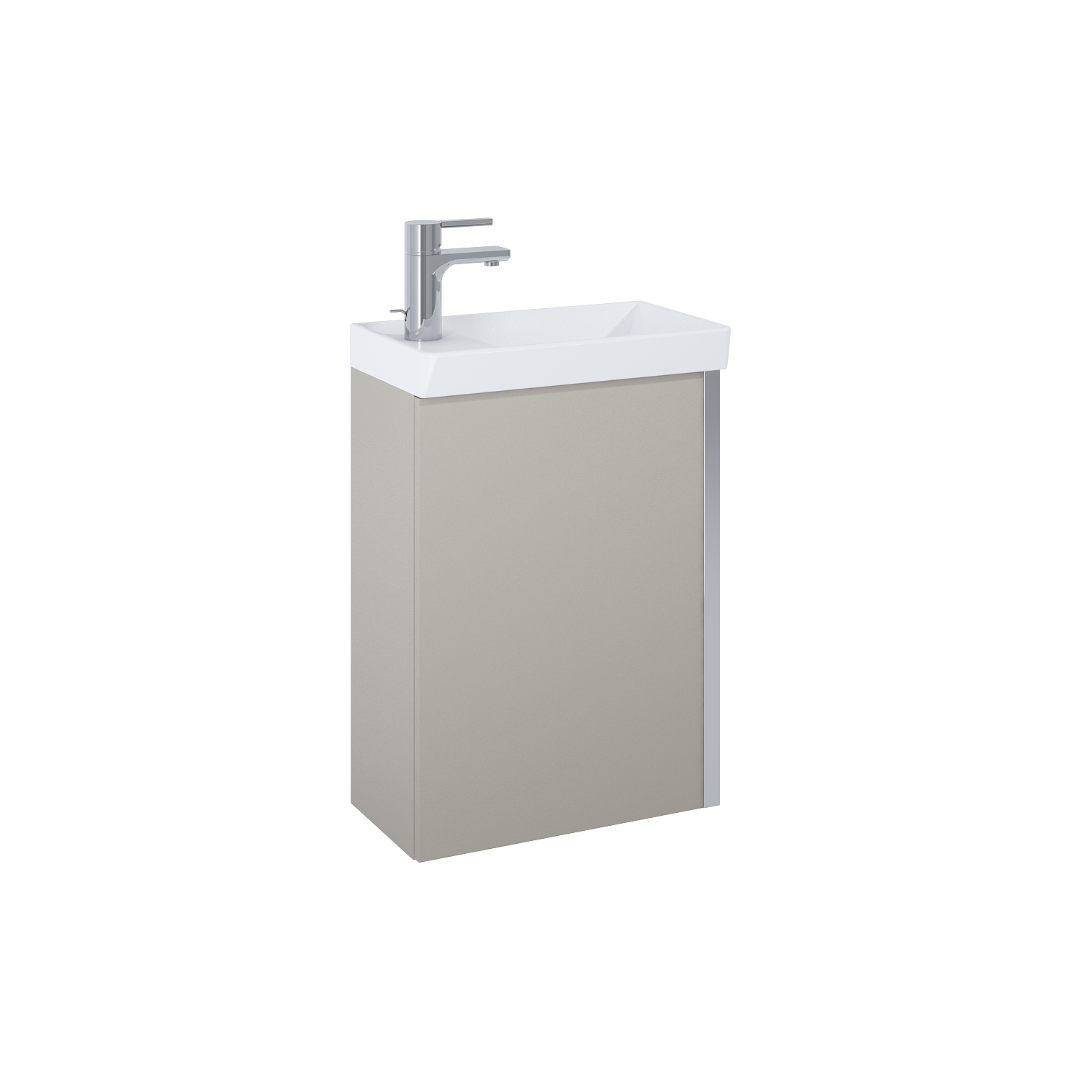 Set Spring 45 cm, 1 drzwiczki, wyposażony w 1 półkę z regulowaną wysokością. Wykonany z materiałów wysokiej jakości, front i korpus z płyty laminowanej, lakierowanej w kolorze fume matt, okucia z funkcją cichego, miękkiego samodomyku. Uchwyt boczny, metalowy w kolorze chrom. Set składa się z szafki podumywalkowej i umywalki.