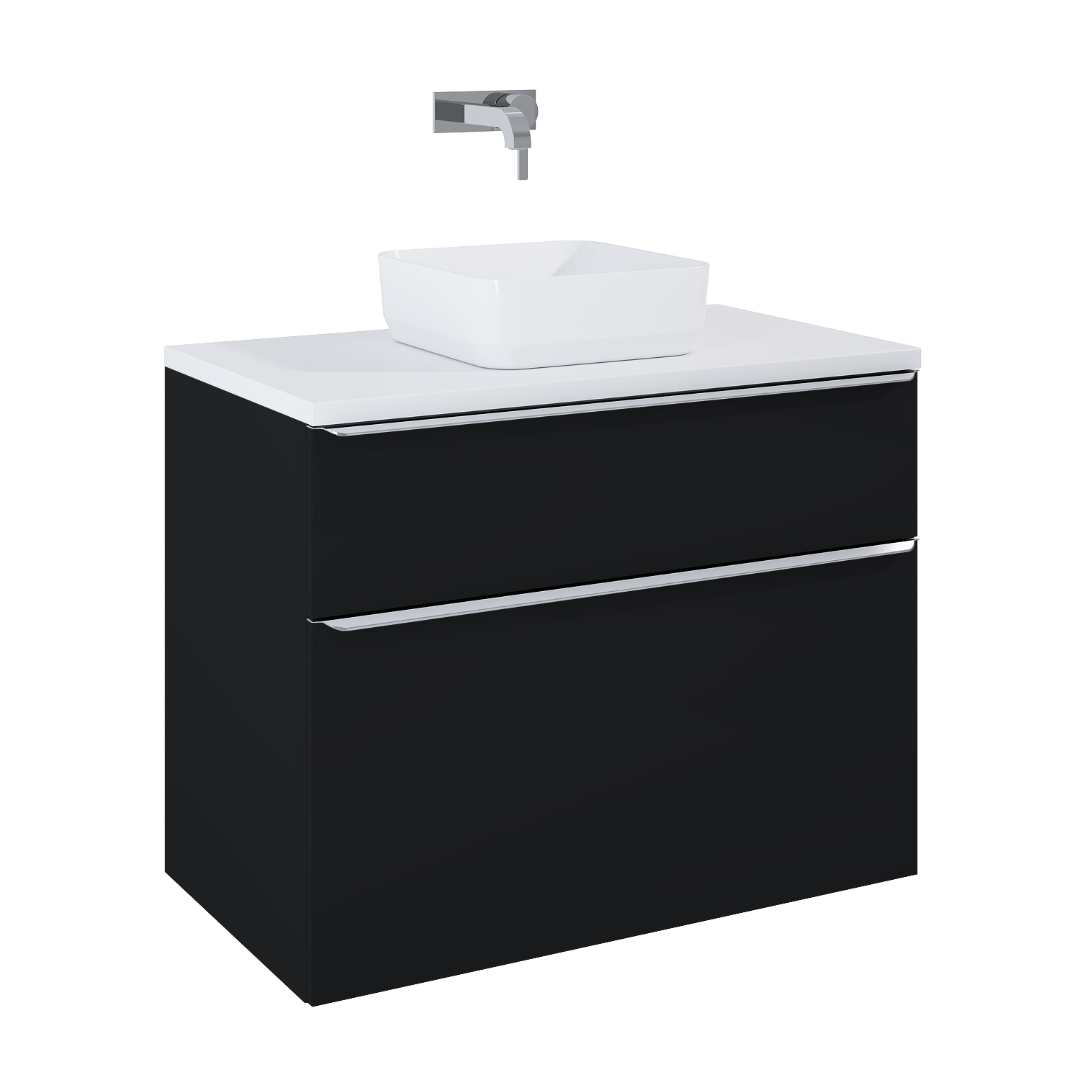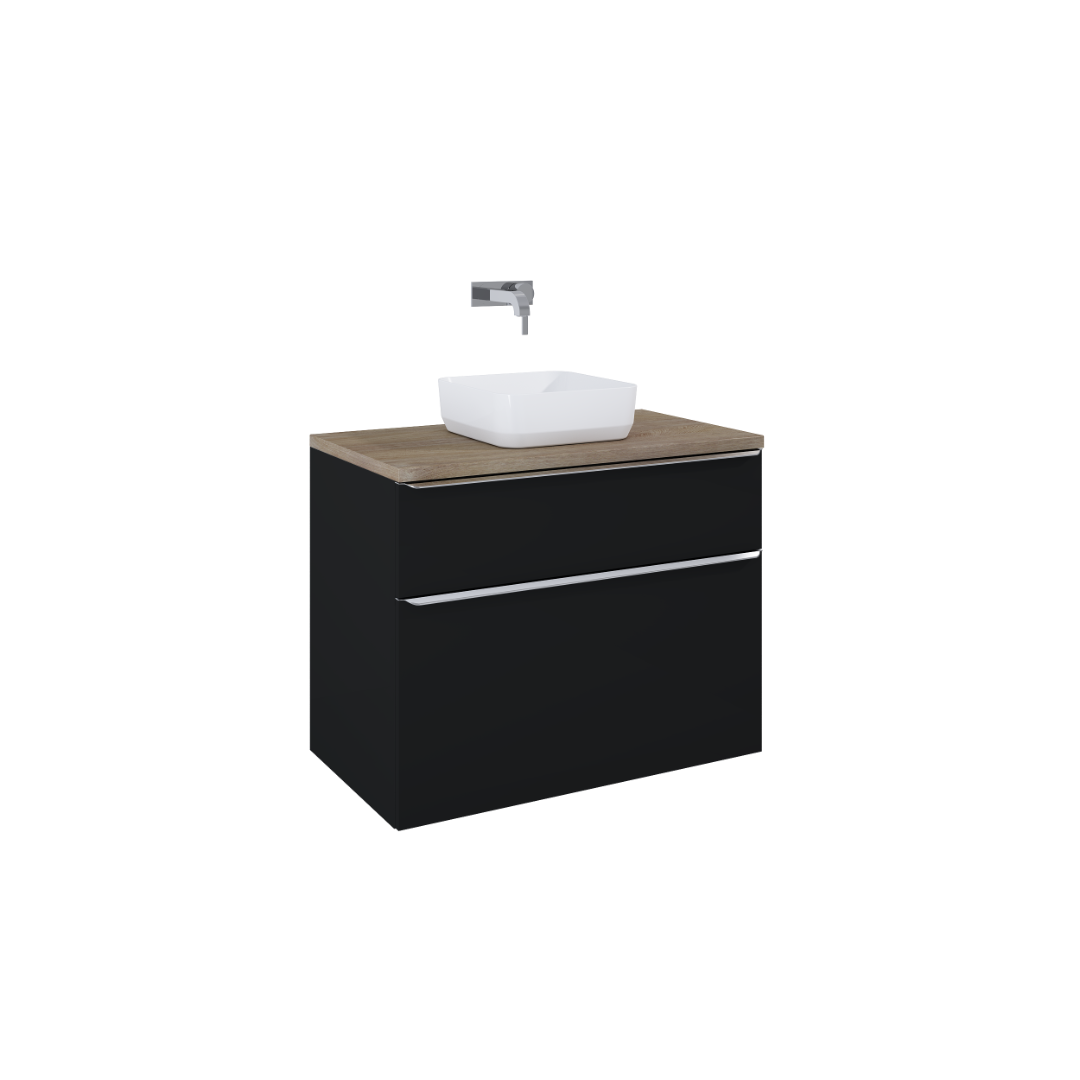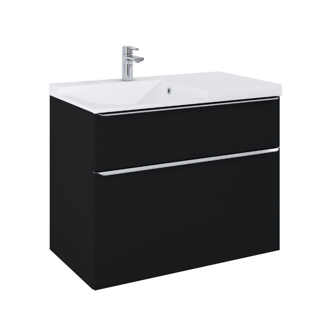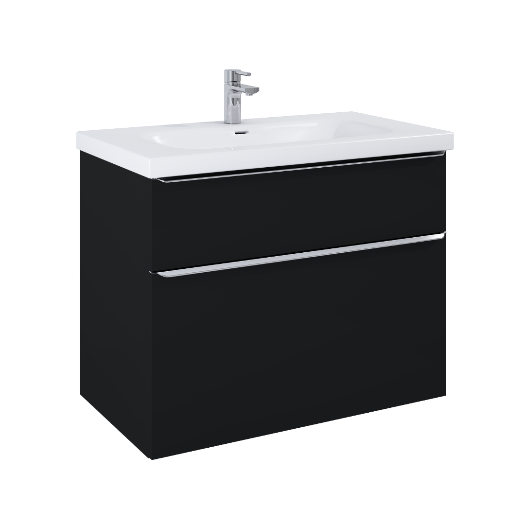 Szafka podumywalkowa Lofty 90 cm, 2 szuflady z funkcją cichego samodomyku oraz z pełnym wysuwem. Pierwsza szuflada zaopatrzona w organizer. Szafka wykonana z materiałów wysokiej jakości, front i korpus z płyty laminowanej, lakierowanej w kolorze black matt. Szafka jest sprzedawana bez uchwytów. Uchwyty do nabycia osobno - dostępne kolory: chrom, gold, black.