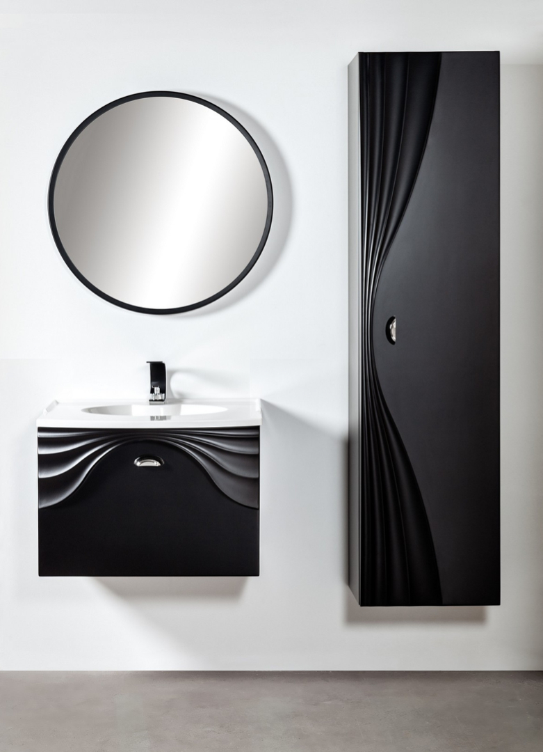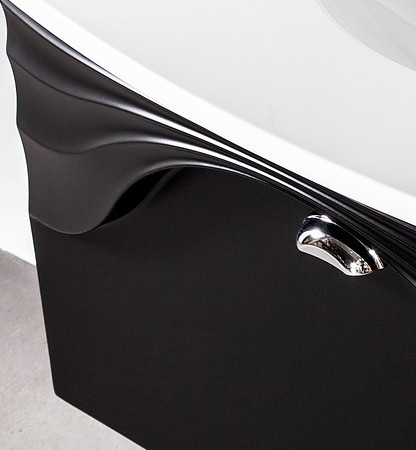 Szafka łazienkowa pod umywalkę jest wykończona w kolorze czarny mat. Front nawiązuje do motywu fali. Wyprodukowany według unikatowej technologii z całkowicie wodoodpornych materiałów bez udziału produktów drewnopodobnych.
