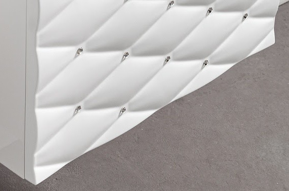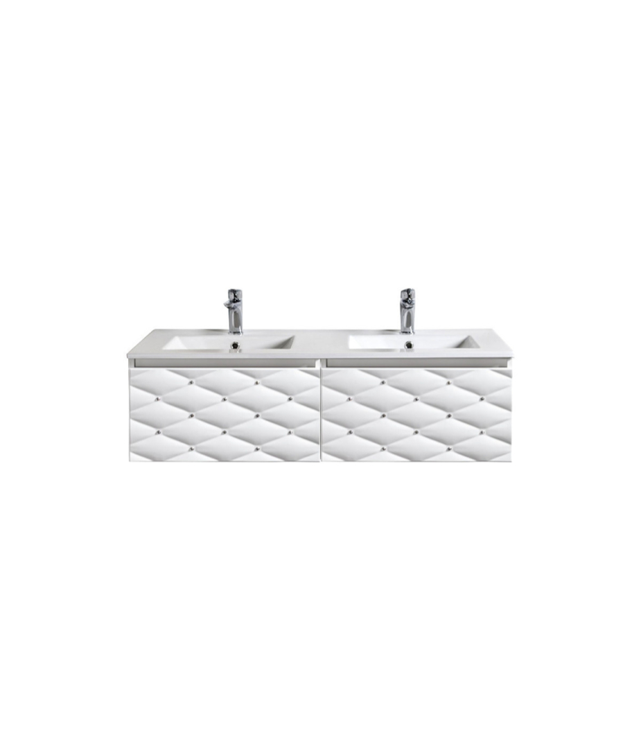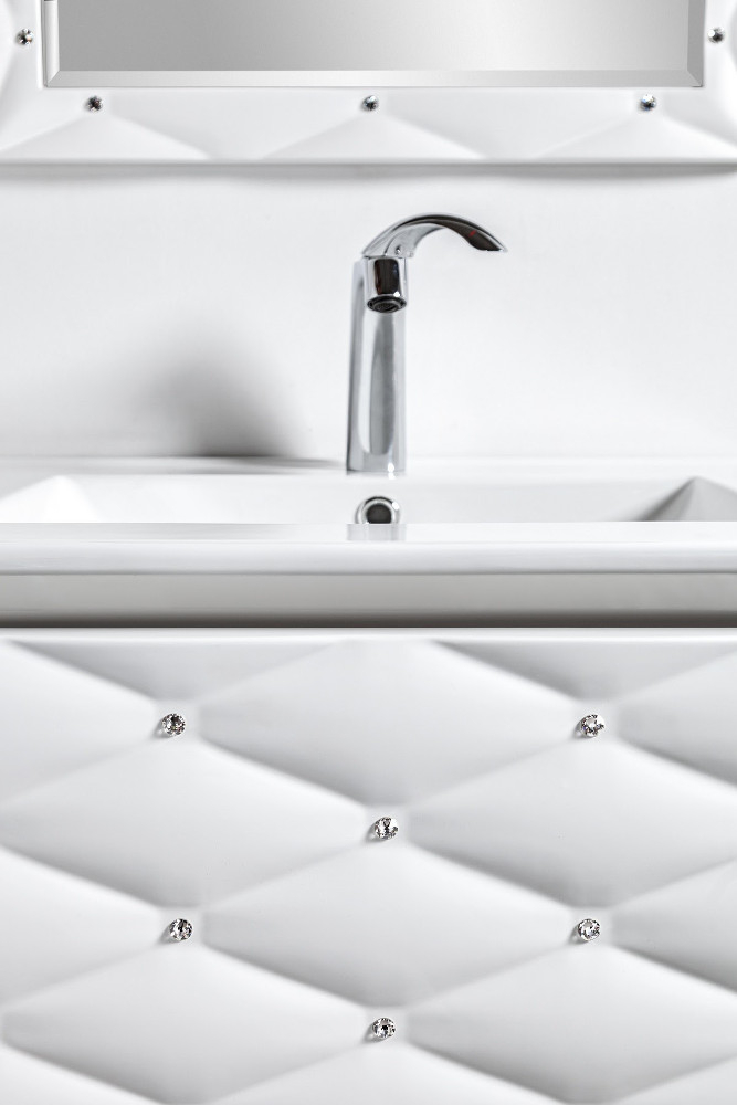 Podwójne szafki łazienkowe w uniwersalnym białym kolorze. Srebrne kryształki Swarovskiego i efektowne tłoczenie na frontach nadają całości charakter glamour. Wysoka jakość zapewniona przez wodoodporny materiał. Wymiary: 33 cm x 120cm.