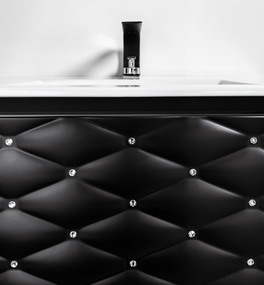 Szafka łazienkowa została wykonana z materiałów odpornych na wilgoć i wysoką temperaturę, a wykończenie w kolorze czarnym doskonale wpisuje się w najnowsze trendy. Szafkę łazienkową warto uzupełnić o inne elementy kolekcji jak regał i lustro, by stworzyć atrakcyjną i konsekwentną stylizację. Szafkę można również zamówić z kryształkami w kolorze złotym lub bez kryształków.
